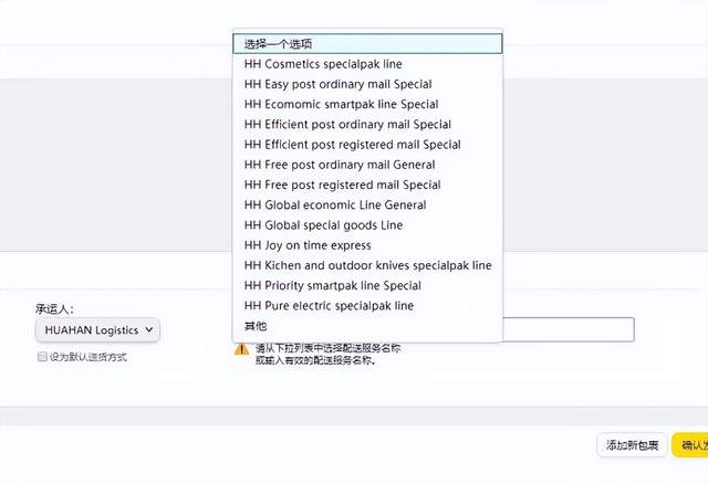 - 第一步:选择承运人:例如:HUAHAN Logistics
